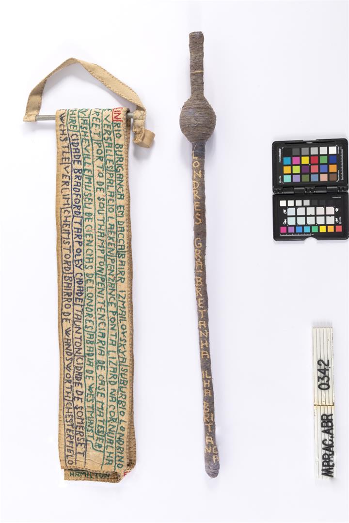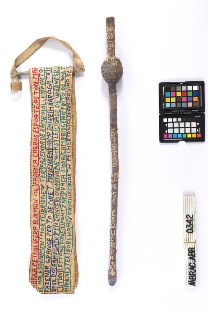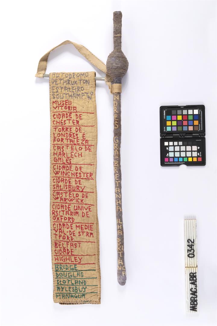 Faixa de miss e cetro em ORFA. Faixa de miss, dobrada no sentido da altura e costurada na ponta direita; bordada na parte externa e interna. Bandeira da Inglaterra bordada na faixa. Suporte em alumínio, com alça em tecido costurado nas bordas, servindo para sustentar a faixa e o cetro. ORFA representando um cetro, constituído por vara vertical com protuberância esférica no terço superior.