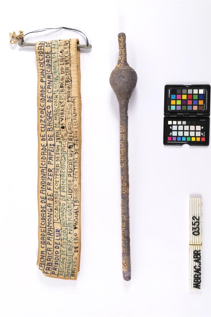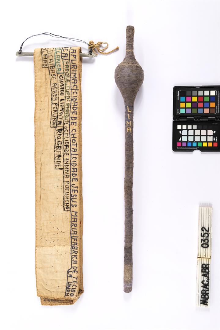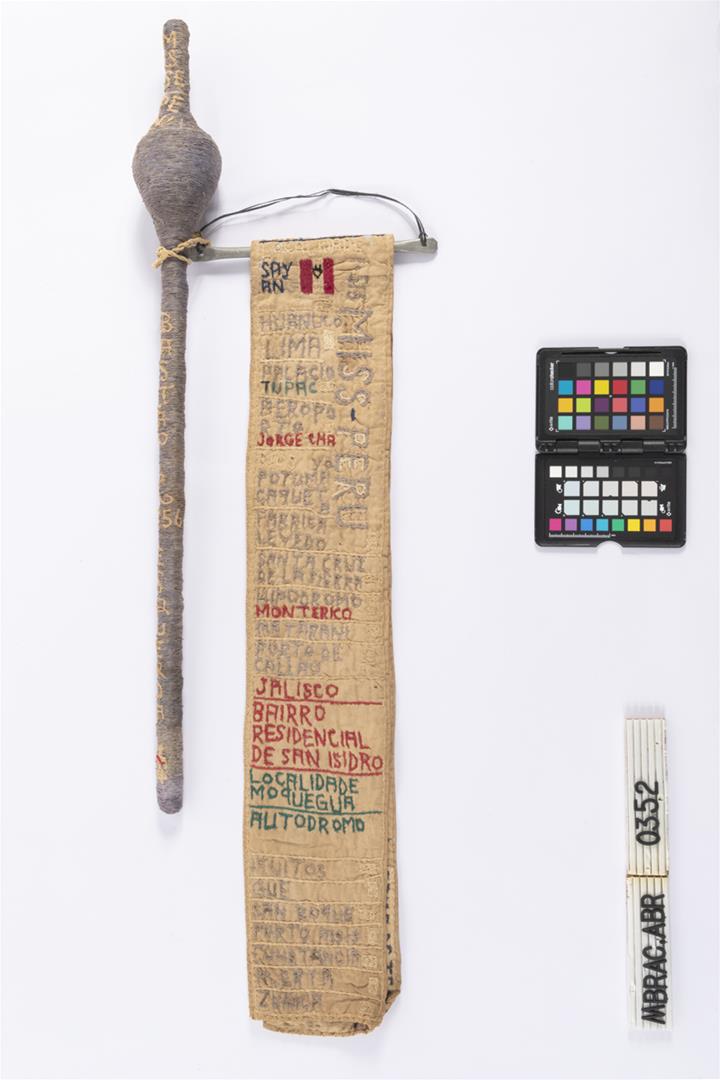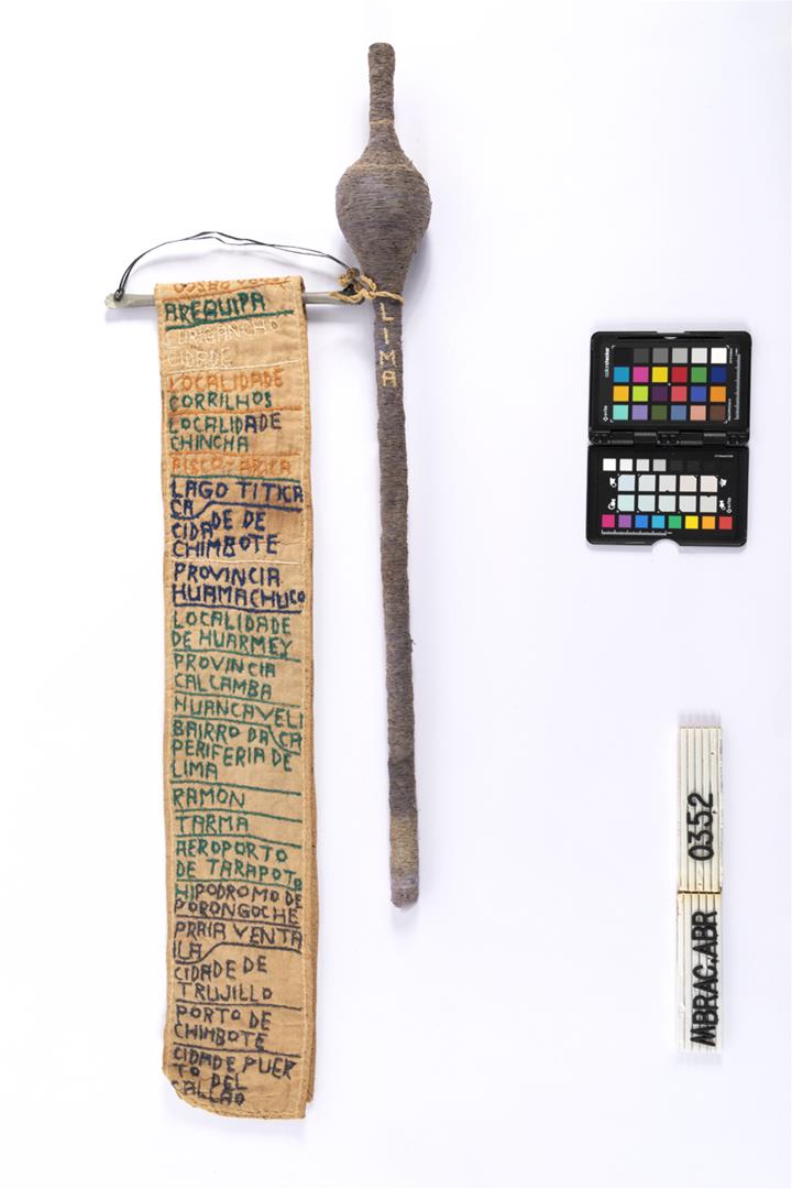 Faixa de miss e cetro em ORFA. Faixa de miss, dobrada no sentido da altura e costurada na ponta direita; bordada e inscrita na parte externa e interna. Bandeira do Peru bordada na faixa. Suporte em alumínio , com alça em plástico, e barbante amarrando o cetro. ORFA representando um cetro, constituído por vara vertical com protuberância esférica no terço superior.
