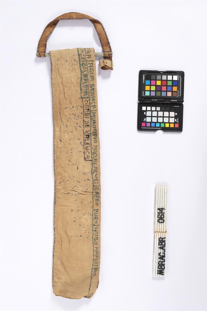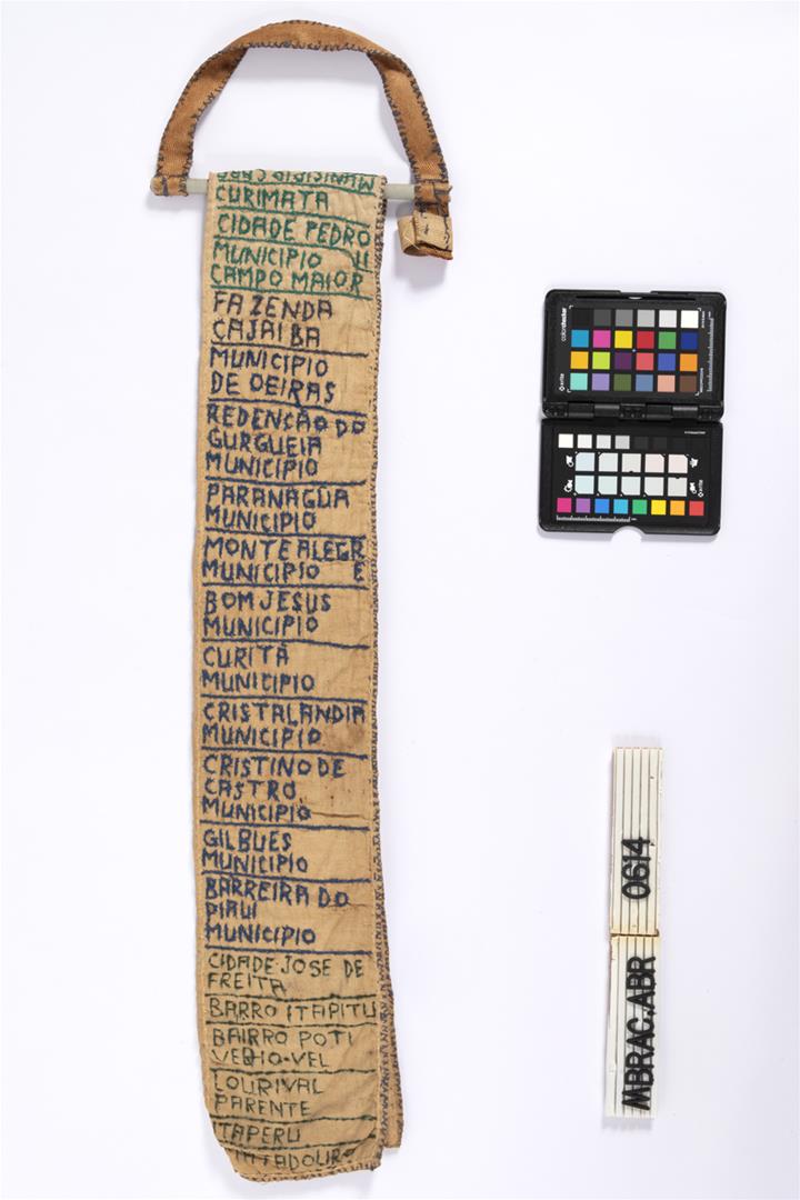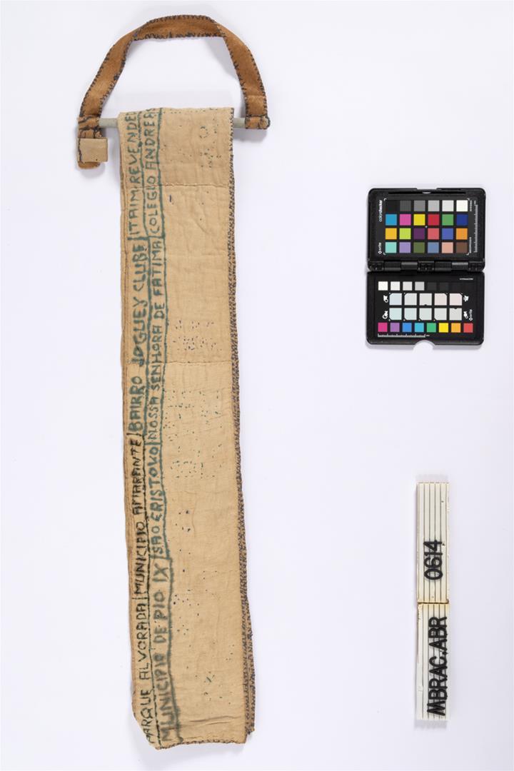 Faixa de miss, dobrada no sentido da altura e costurada na ponta direita; bordada e escrita na parte externa. Suporte em alumínio com alça em tecido costurado nas bordas, servindo para sustentar a faixa.